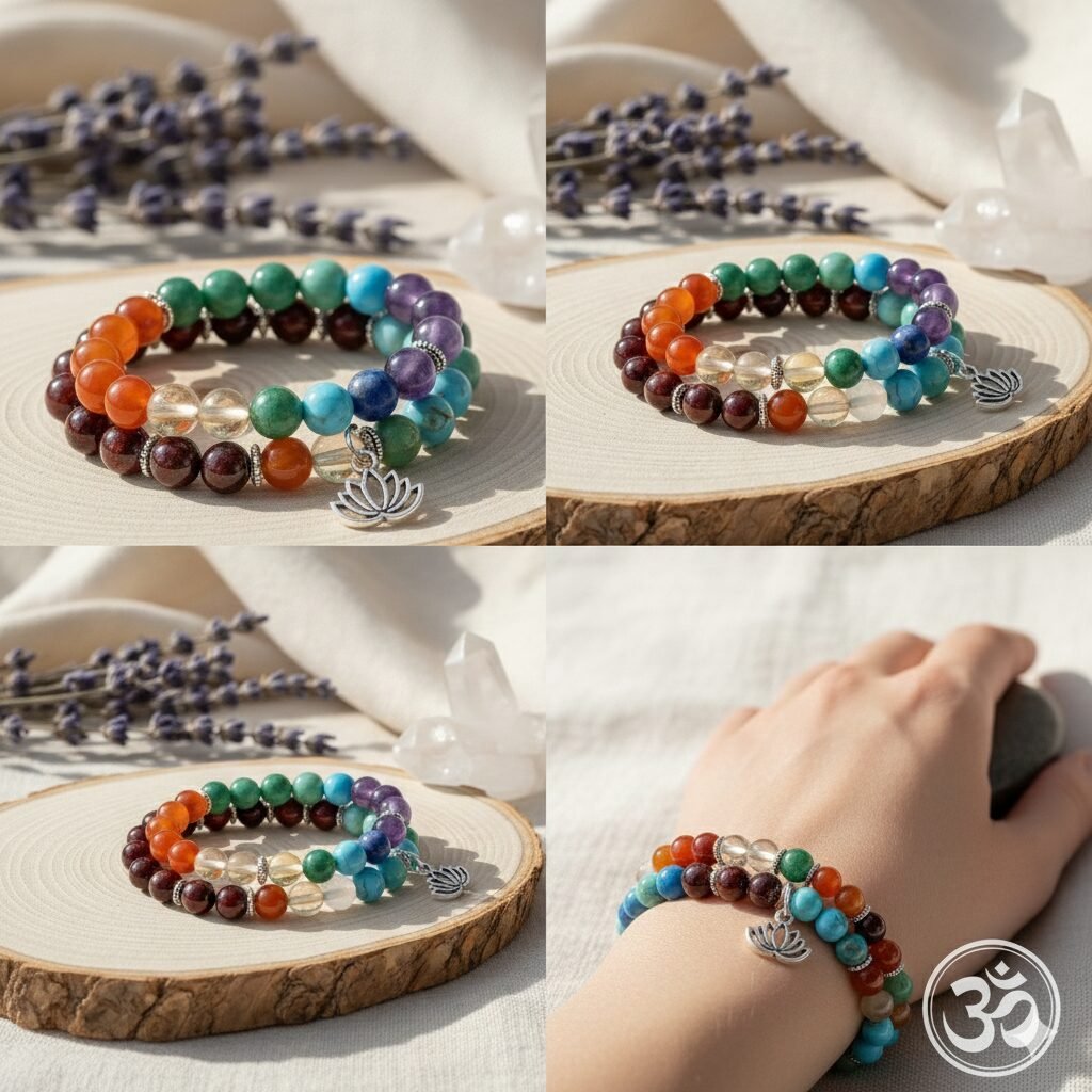Seven Chakra Alignment: Each bracelet showcases seven distinct natural gemstones corresponding to the energy centers of the body, moving from the Root Chakra (red/dark stones) to the Crown Chakra (violet/purple stones).
